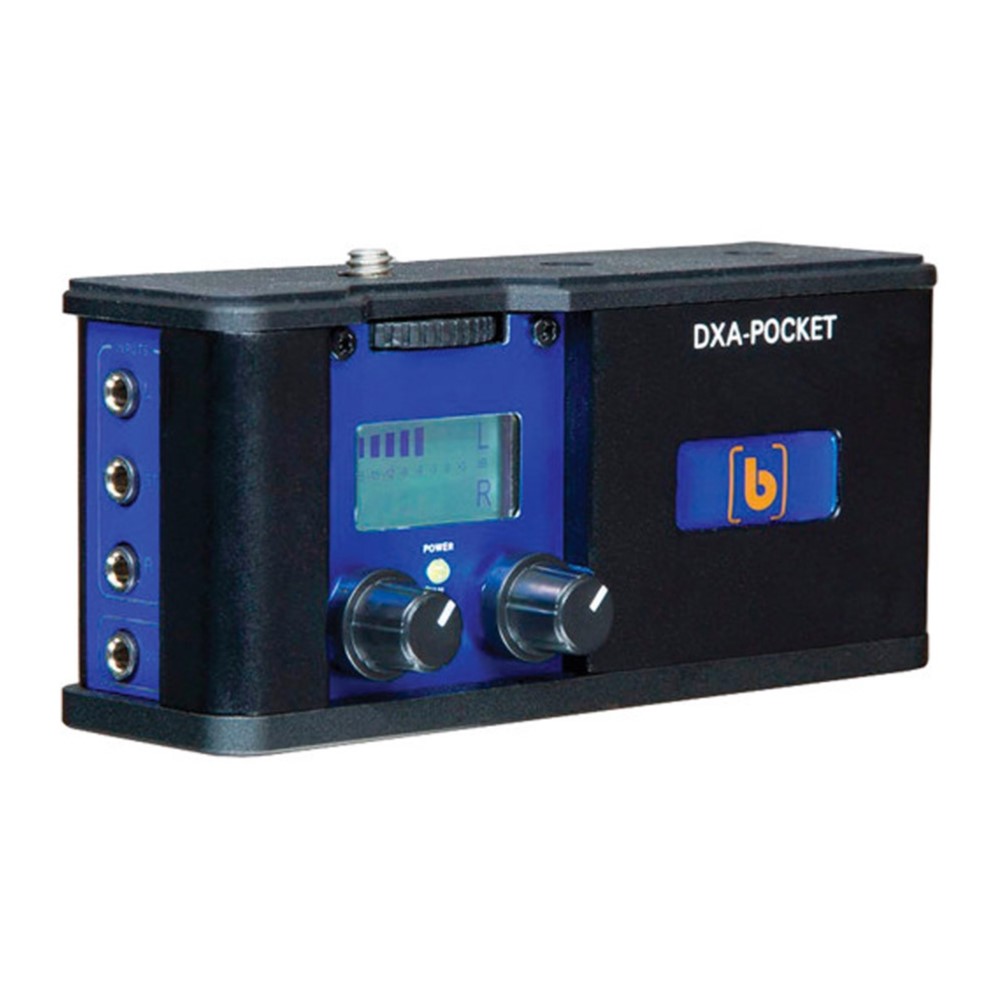The DXA-POCKET is very easy to set up and use. The inputs provide for two mono mics or one stereo mic to be easily connected. Exceptionally low-noise preamplifiers provide very clean, wide bandwidth audio for full rich sound. This eliminates the need to rely on the camera preamplifiers as they are rather noisy at high gain. Dual trim controls allow you to adjust the signal levels independently – you can even set two different levels for a mono mic for both channels giving you a backup in case one channel is blown out. The bright, easy to see VU meters make it easy to set the precise recording levels for optimum results.