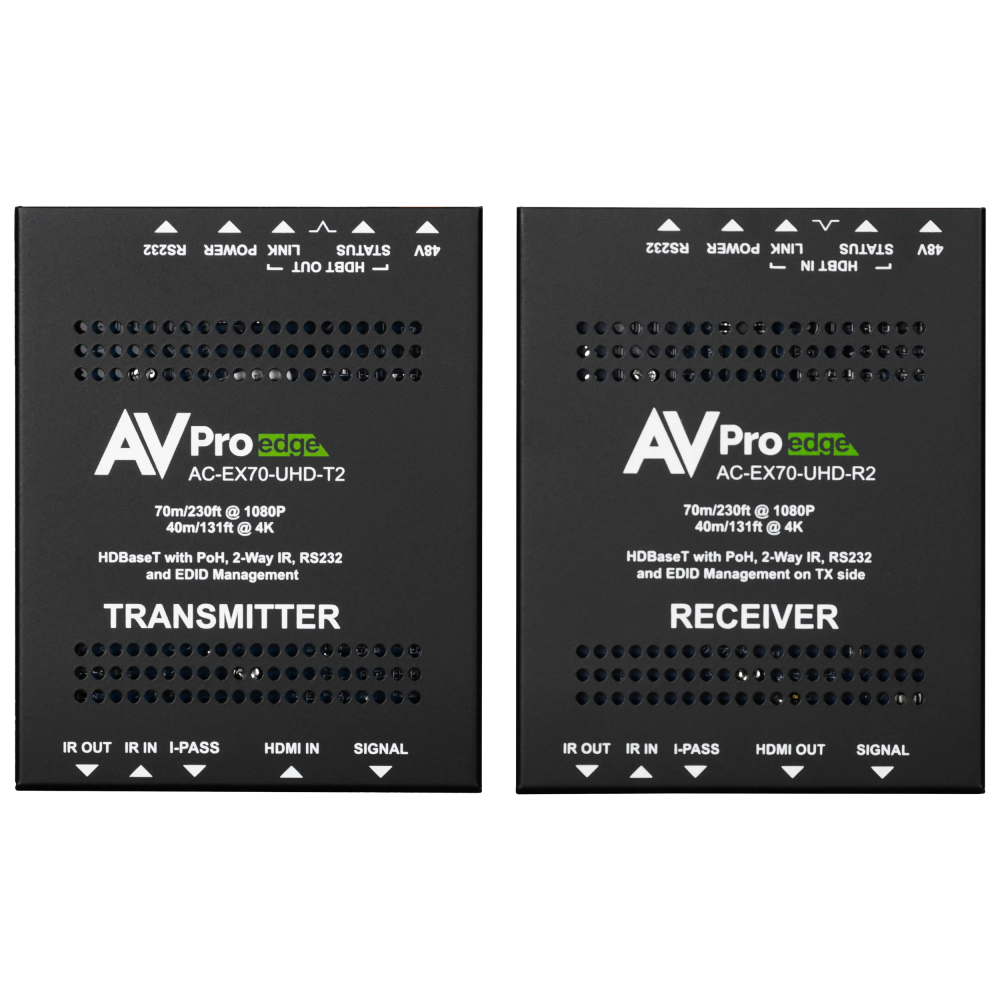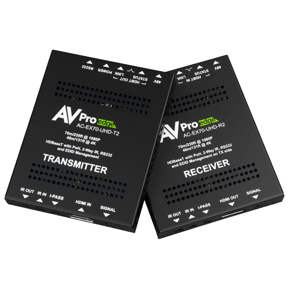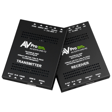 HD & UHD 4K HDMI EXTENSION: HDCP was conceived to assure content holders copy protection for their media. The 19 conductor HDMI format was designed to facilitate this process when transporting media between devices, using a total of 8, small gauge wires to handle video information with the bulk of those remaining devoted to system policing. It wasn’t envisioned that sources would be placed elsewhere than the immediate display location, and the first HDMI cable designs dramatically exemplified these inherent problems with a useable HDMI cable length barely exceeding fifteen feet. Over time, this thankfully has been addressed in a variety of well-sorted ways, including AVPro Edge Bullet Train cables. Still, there are no “on-site, made to length” HDMI cables; electronic extension kits using category wire have resolved this issue, plus offering additional application options. AVPro Edge’s pioneering AC-EX70-UHD-KIT was among the first HDMI signal extension packages to perfectly preserve all the fidelity in the original signal.