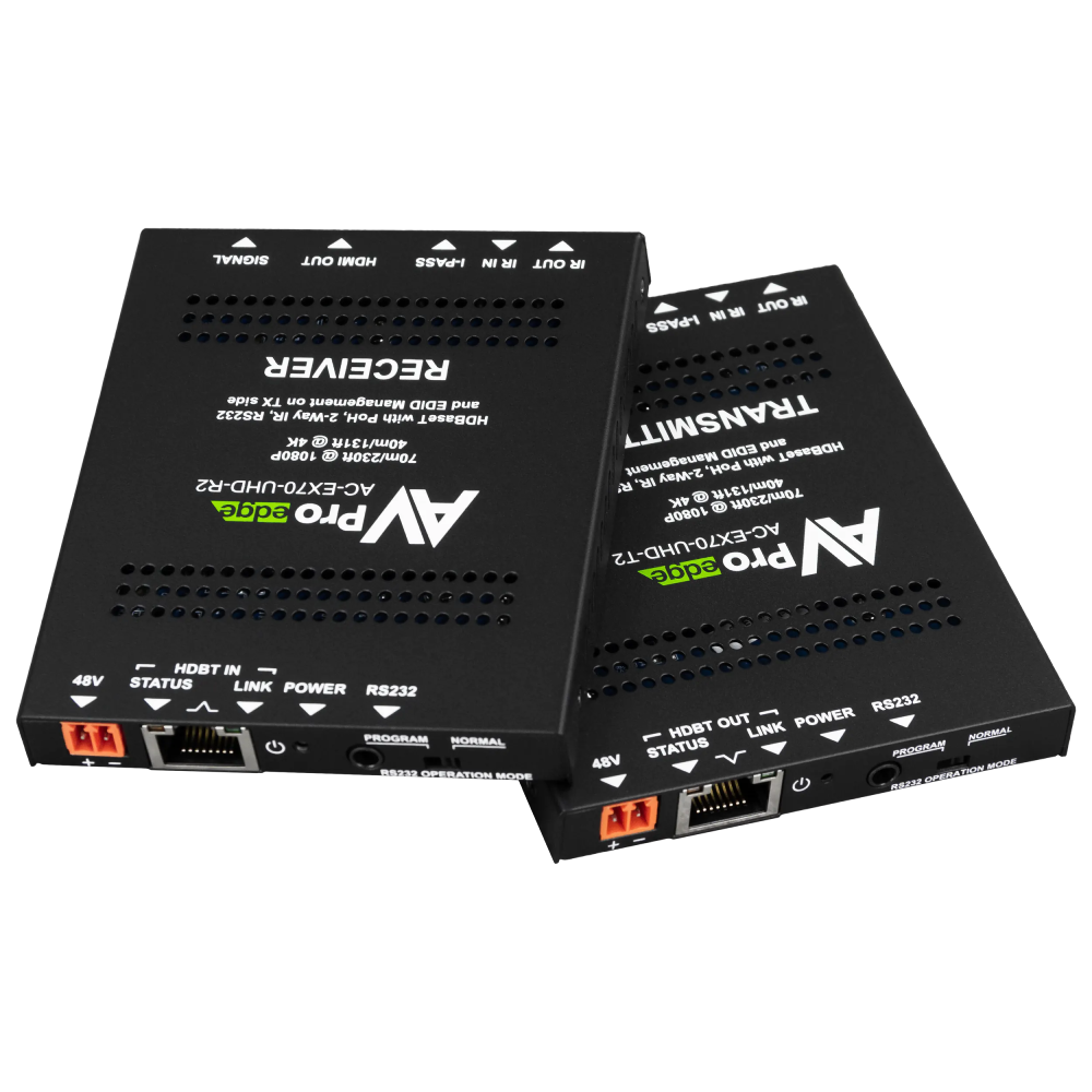 CONTROL OPTIONS: Configurable, bidirectional control for IR & RS-232 signals provides a carefully nuanced added plus to the AC-EX70-UHD-KIT, consolidating wiring to a solitary pull and mitigating the use of supplemental devices for a clean, efficient installation. Simplified control requirements can take advantage of the AC-EX70-UHD-KIT’s I-PASS, forwarding commands directly from a control system IR-out port into the TX unit I-PASS input, proceeding to the receiving end and routing directly from the RX unit’s IR-out into the display’s IR input jack (if equipped) or through an attached IR emitter.
