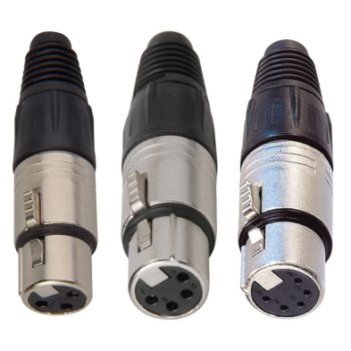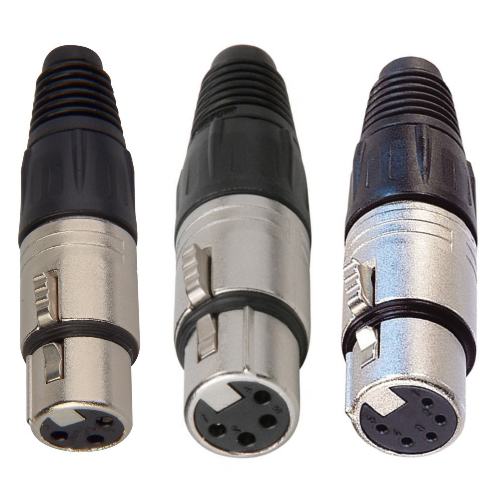 XLR female in-line connectors including 3, 4, and 5-pin configurations, designed for professional audio and signal applications.