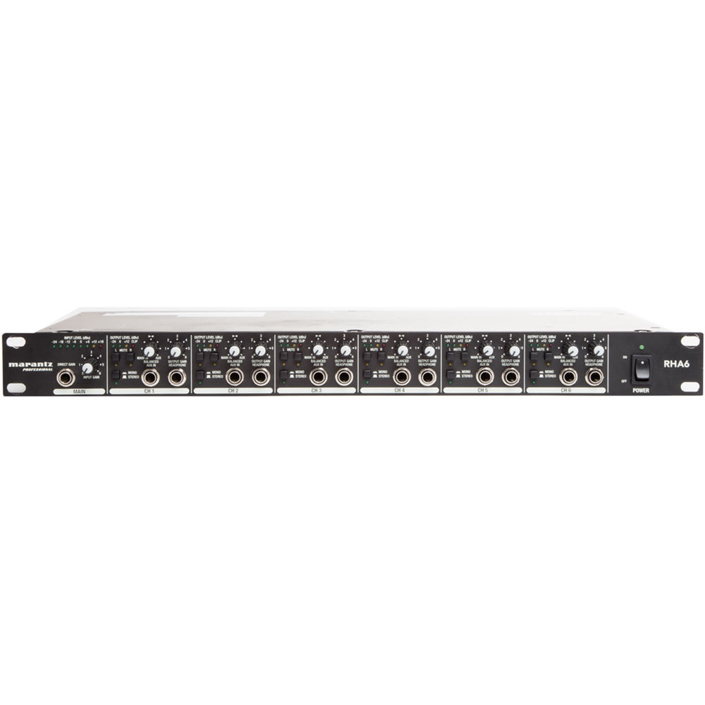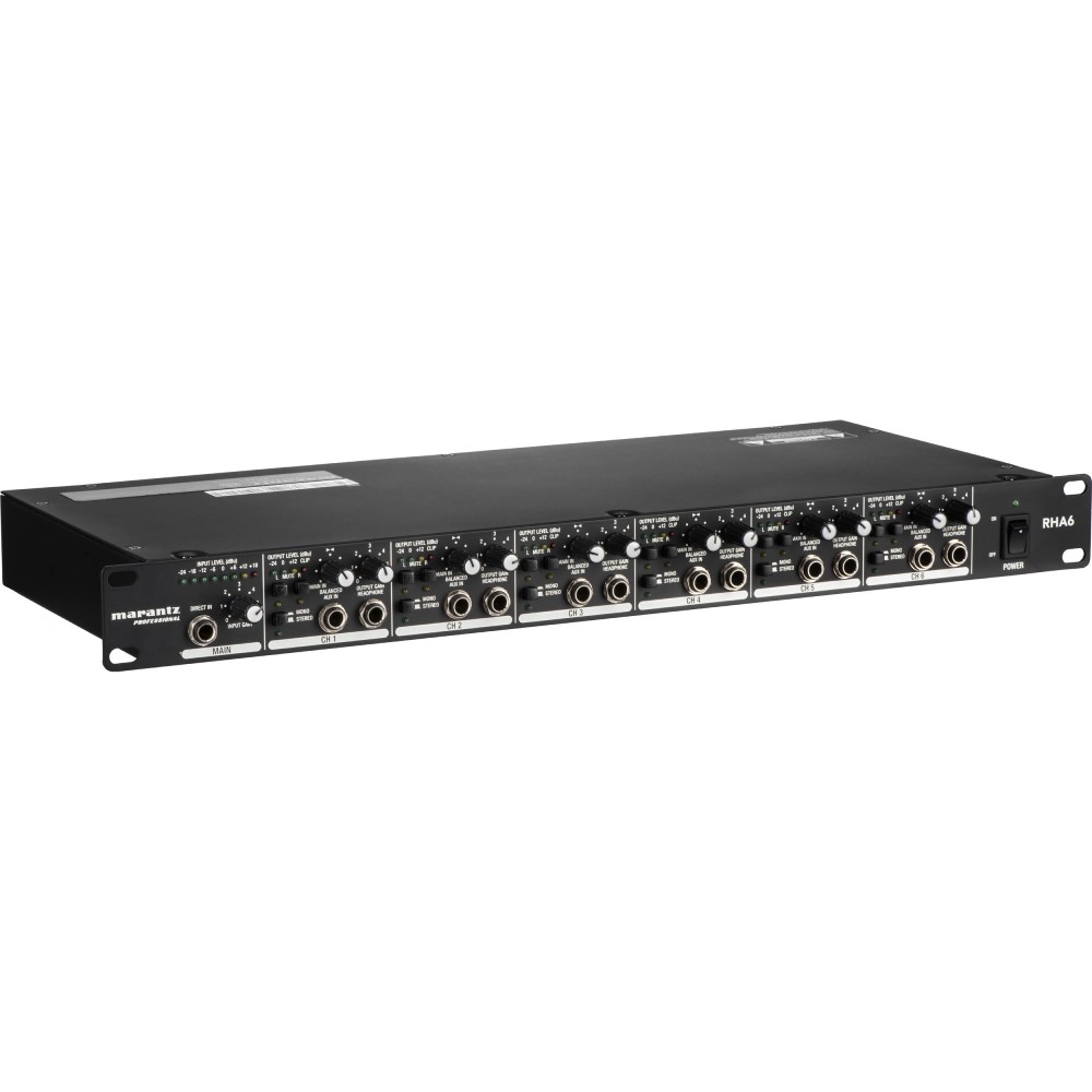 The RHA6 is a 6-channel professional headphone amplification system perfect for studio and live event monitoring. AUX and Direct inputs make it possible to create custom headphone mixes, and additional features such as direct line outputs to connect additional RHA6 units and three headphone outs per channel provide maximum versatility. RHA6 has a minimized circuitry path which means there's less “stuff” for your signal to pass through, keeping your sound clear and crisp.