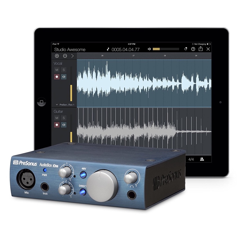 Record Anything, Anywhere.The Singer/Songwriter’s Best Friend AudioBox iOne: The USB/iPad Recording Solution for Guitarists and Songwriters. The interface for guitarists and songwriters on the go. Inspiration is everywhere for singer/songwriters, so bring your studio with you and record wherever you go. The PreSonus AudioBox® iOne lets you capture your voice and instrument on your Mac, Windows PC, and iPad. Simply plug in your guitar and microphone, and you’re ready to create! USB bus-powered and bundled with powerful, easy-to-use recording software, the AudioBox iOne makes it easy to capture ideas and create professional-quality recordings. Mobile recording made easy. The AudioBox iOne and its software library make recording your compositions and tracks easy! Record in stereo on your iPad with free Capture™ Duo or record up to 32 tracks with affordable Capture for iPad. Then wirelessly beam your iPad tracks to our award-winning Studio One® recording and production software for Mac or Windows for editing and mixing. Or do the whole project on your laptop with Studio One. Either way, the AudioBox iOne and its software library provide all the tools needed to record on the road and in the studio. Loud and clear. To record great-sounding music, you need outstanding preamps and digital converters. And to hear what you’re doing, you need a headphone amp that keeps up with the rest of the design. The AudioBox iOne delivers it all! We’re famous for our award-winning microphone preamplifiers, and we’ve equipped the AudioBox iOne with a new, sweet-sounding mic preamp that will capture your voice in all its glory. Clean, clear, 24-bit, 96 kHz digital converters and an ultra-loud, crystal-clear headphone output ensures you hear every detail. Built to travel. AudioBox iOne is a mobile interface in the best sense of the term. It can sit on a tabletop or fit in the pocket of a backpack or laptop bag and works with standard iOS power accessories. Its metal chassis is built like