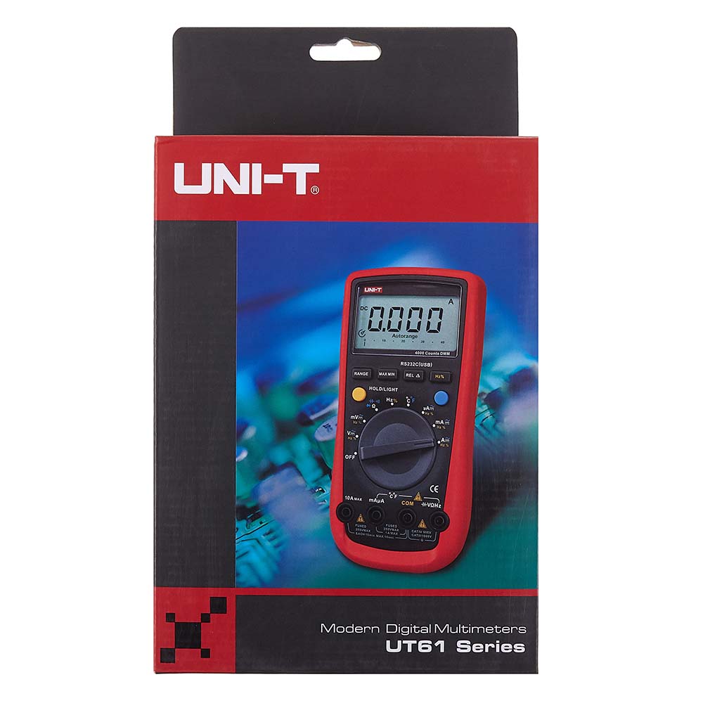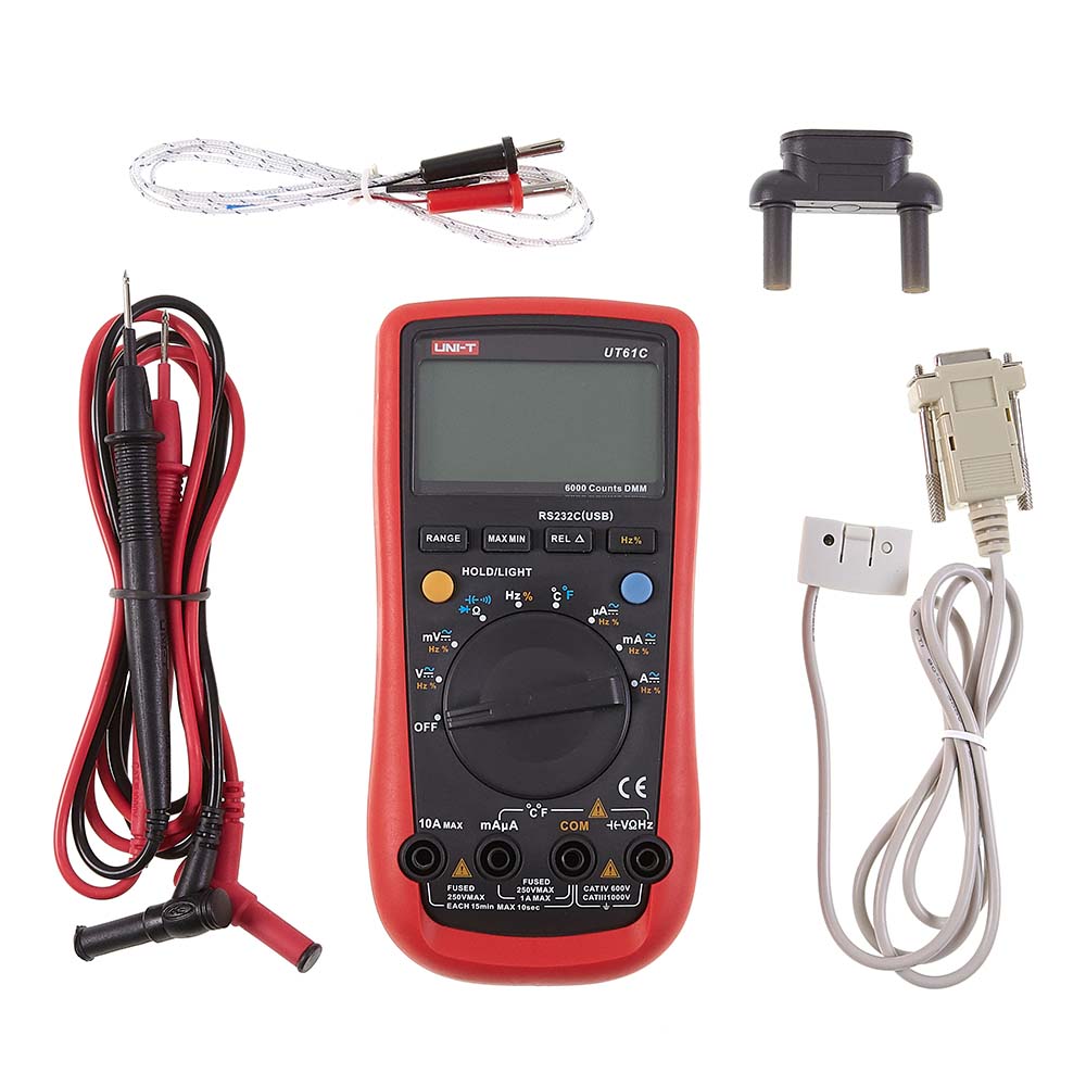● Auto range ● MAX/MIN/REL mode ● Auto power off ● LCD backlight ● RS-232 and USB interface ● Analog bar graph ● Low battery indication ● K-type temperature probe ● Diode/continuity buzzer ● Data hold ● Input protection