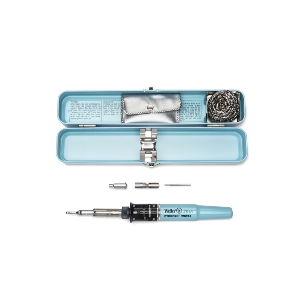 Butane Gas Powered Profi Line Soldering IronThe Weller Cordless Pyropen is a manually ignited, butane gas operated, soldering iron with solder, hot blow and blow torch functions. Its ideal to for soldering on the go and helps to complete soldering tasks anywhere, without the need for a mains supply or an obstructing cable. The Butane gas soldering iron has a rapid heat up time and duration of operation from one filling of approximately 3 hours. It offers temperature adjustment variable between 200°C to 500°C when used as a soldering iron and up to 700°C when used as a hot air blower and 1300°C when used as a blow torch.