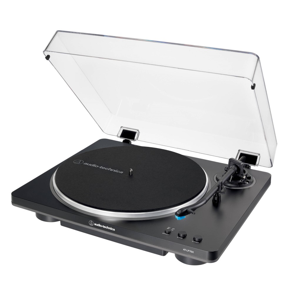 The AT-LP70X Fully Automatic Belt-Drive Turntable is the perfect beginner turntable for those beginning their audiophile journey. Designed to offer a quality sound experience for those who love listening to records, from flipping through albums at the record store to placing a record on the turntable, cueing the tonearm, and sitting back with the album art in hand to enjoy music as the artist intended. Combining the experience of warm, analog audio with user-friendly features, this turntable plays both 33-1/3 and 45 RPM records and has a built-in switchable phono preamp that allows the turntable to connect to a home stereo, powered speakers, or another component, with or without a dedicated phono input.
