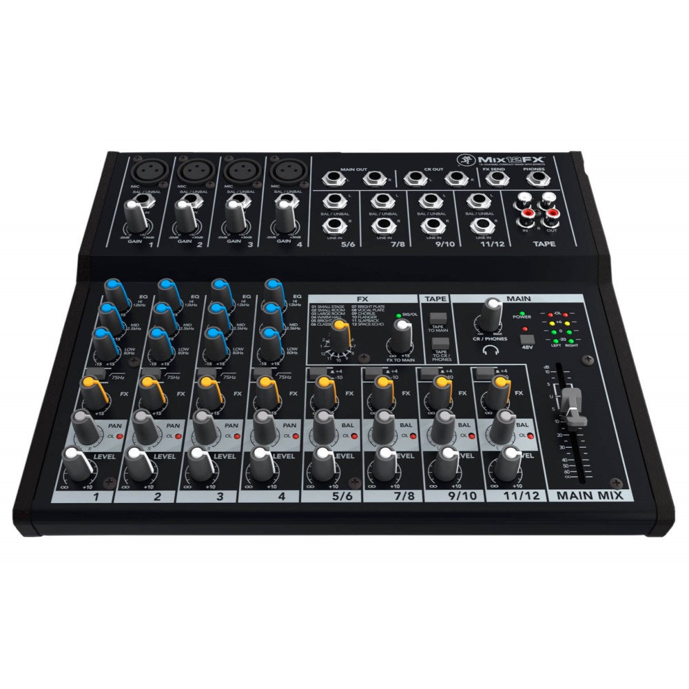 Adding depth and dimension to your mixes has never been easier—or more affordable. With 12 onboard effects, the Mackie Mix12FX makes adding depth to your vocals, drums, keyboards and more a breeze. Our 12-channel mixer features four microphones/line inputs that are equipped with our low-noise, studio-quality preamps, a high-pass filter and 3-band EQ to fine-tune your sound. Plus, it offers four stereo channels for keyboards and other line-level instruments and gear.