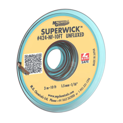 MG Chemicals Unfluxed Super Wick™ is a high-purity, tightly woven copper desoldering braid designed for maximum flexibility in electronics rework and repair. Unlike flux-coated wicks, this braid contains no embedded flux, allowing technicians to apply their preferred flux type—including water-soluble fluxes for aqueous cleaning processes or specialty fluxes tailored to specific production requirements.