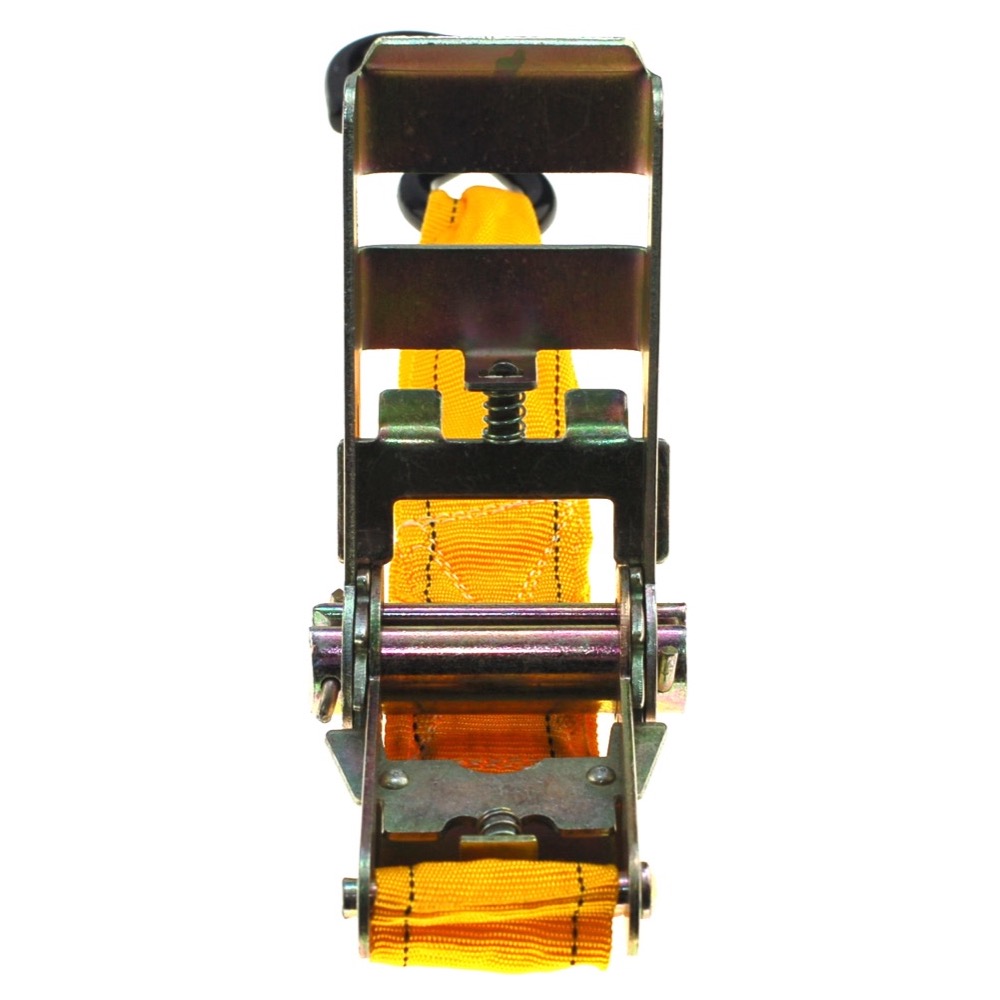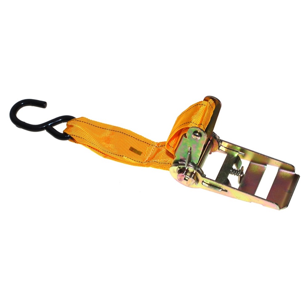 These are excellent quality and easy to use. They feature a ratchet action with a quick release trigger. They are a nylon mesh strap that is tested to 4500 lbs.