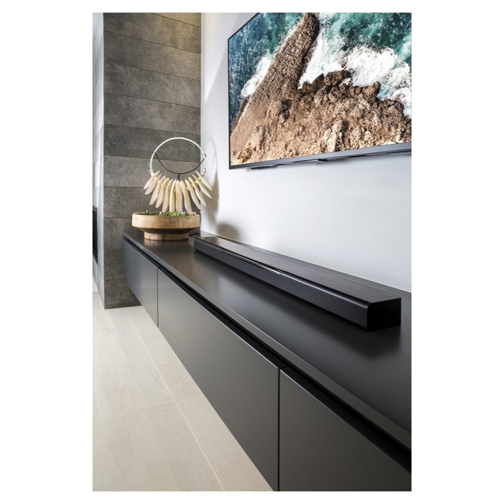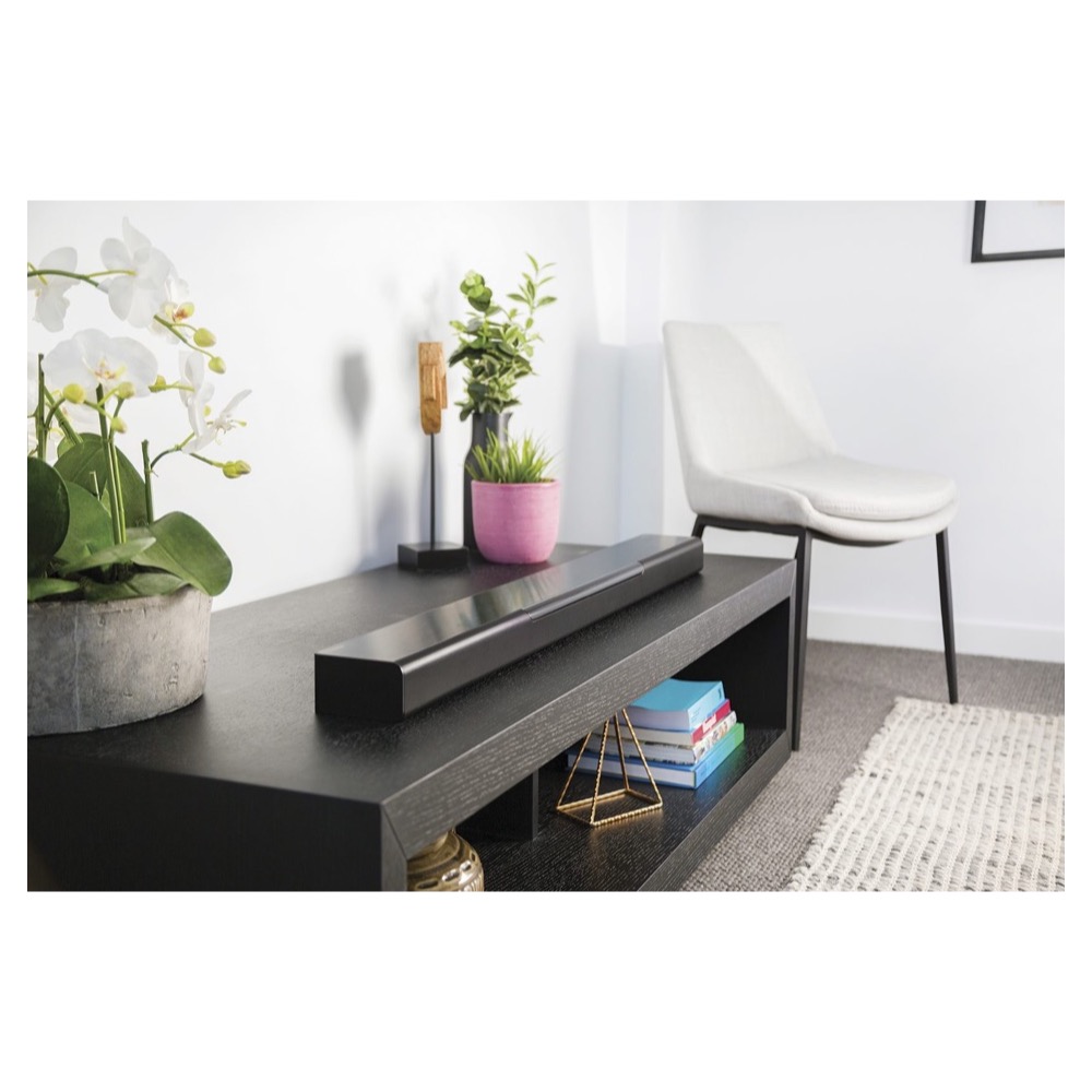 Son profil élancé lui permet de se fondre aisément dans le décor. Il est ainsi possible de la poser discrètement devant un téléviseur à écran plat sans entraver la vue pour autant.