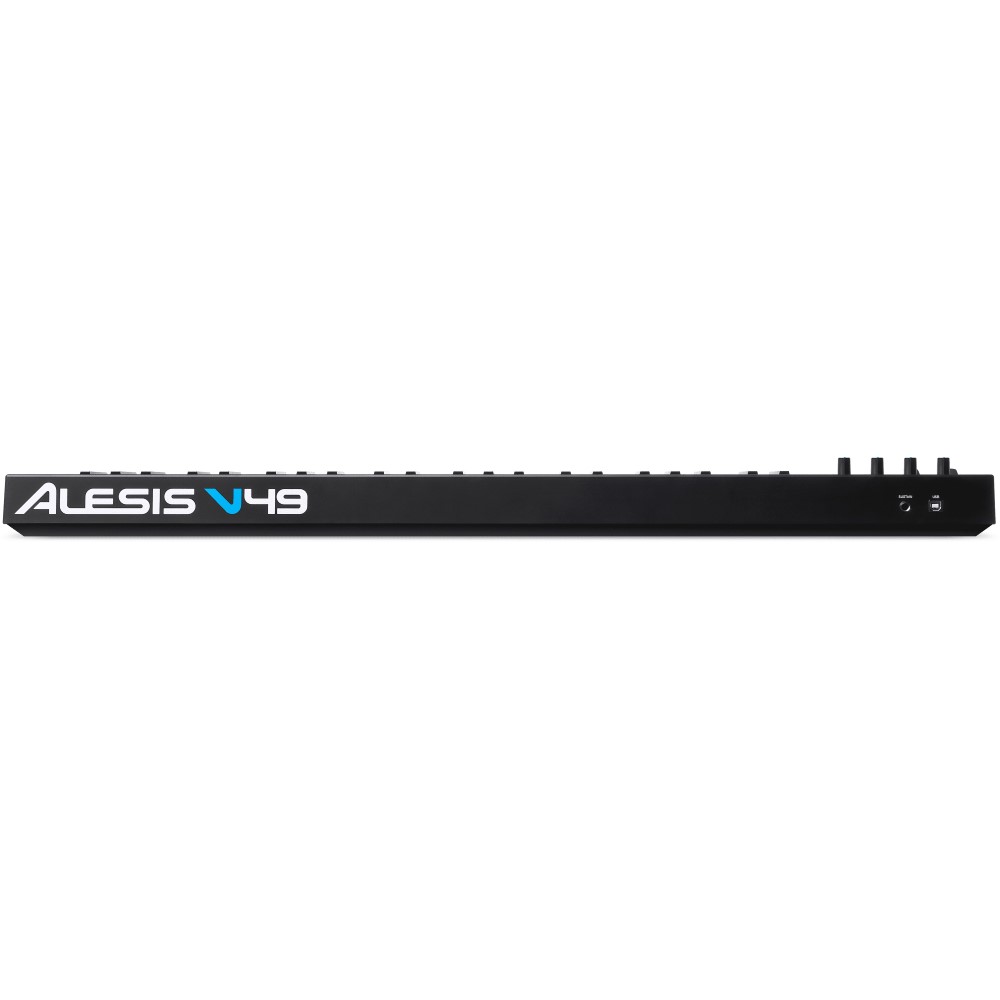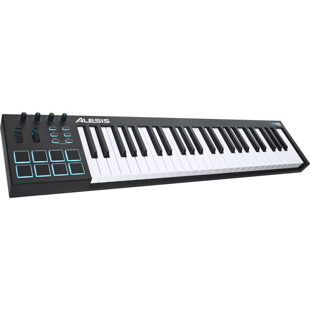 Le Alesis V49 est un contrôleur MIDI puissant et intuitif qui vous permet de prendre le contrôle de votre logiciel musical à l'aide de pads, de boutons et de potentiomètres. Avec ses 49 touches pleine taille sensibles à la vélocité et ses boutons d’octave haut/bas, vous pouvez étendre le clavier à toute la gamme mélodique pour jouer des lignes de basse, des accords et des mélodies. Le V49 comprend également quatre potentiomètres et boutons assignables pour manipuler les effets et instruments virtuels : ouvrez et fermez les filtres, ajustez les volumes, activez les effets, modifiez les paramètres, et plus encore. Huit pads rétroéclairés sensibles à la vélocité permettent de lancer des clips ou de jouer des percussions avec une excellente réactivité, et les molettes de pitch et de modulation renforcent les possibilités expressives de votre performance.
