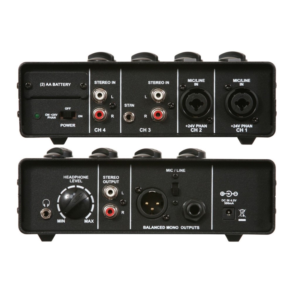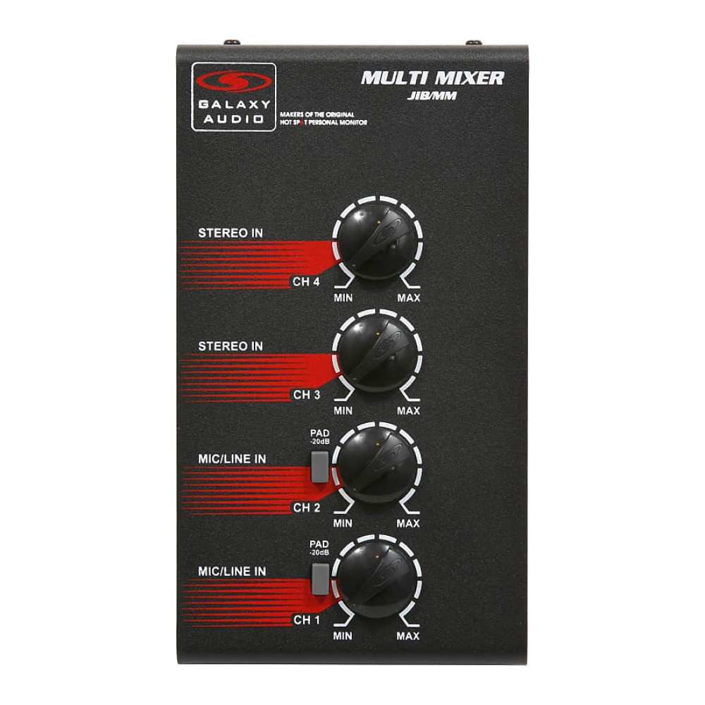 Le Galaxy Audio JIB/MM (Multi Mixeur) est un outil idéal pour la sonorisation en direct, l'enregistrement à domicile, l'enregistrement sur le terrain, l'audio/vidéo, et bien plus encore. Ce mixeur audio pour microphone dispose de 4 entrées : canaux 1 et 2 : combo XLR/jack 6,35 mm avec atténuateur 20 dB, canal 3 : RCA stéréo et mini jack 3,5 mm stéréo, canal 4 : RCA stéréo. Chaque canal dispose de son propre réglage de volume.