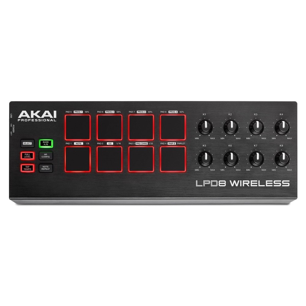 Les six boutons d’interface utilisateur du LPD8 et ses huit potentiomètres assignables au design fin offrent une large gamme de performances et d’options de contrôle. Le nouveau bouton Full Level garantit que vos performances sur les pads sont fortes, claires et à une vélocité uniforme, lorsque le volume égal est indispensable. Le LPD8 Wireless dispose également d’un bouton Note Repeat, parfait pour les artistes de musique dance qui aiment créer des montées avant le drop. Les artistes peuvent utiliser le bouton NR Config pour contrôler et affiner les paramètres de Swing et de division temporelle.