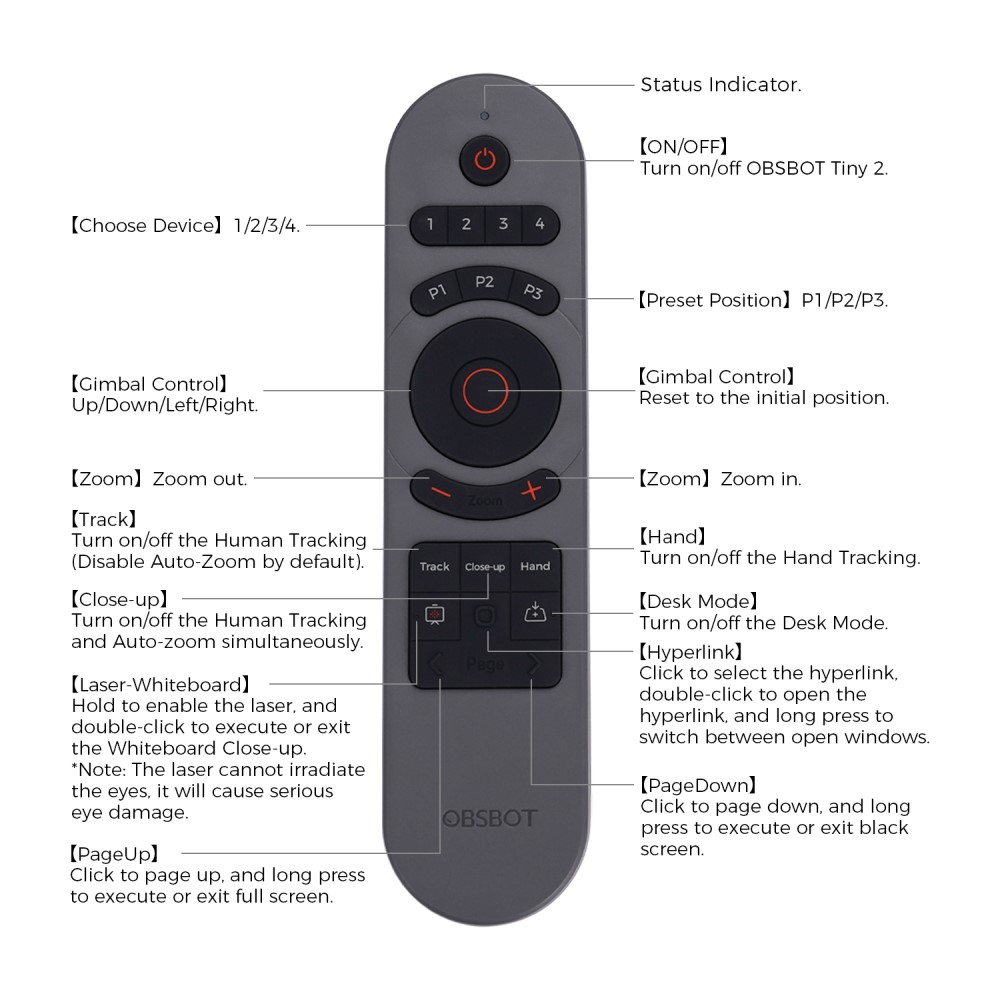 Pas seulement pour contrôler à distance l'OBSBOT Tiny 2, nous avons combiné la fonction d'un clicker de présentation avec la télécommande, vous pouvez désormais utiliser la télécommande pour mieux présenter votre idée.