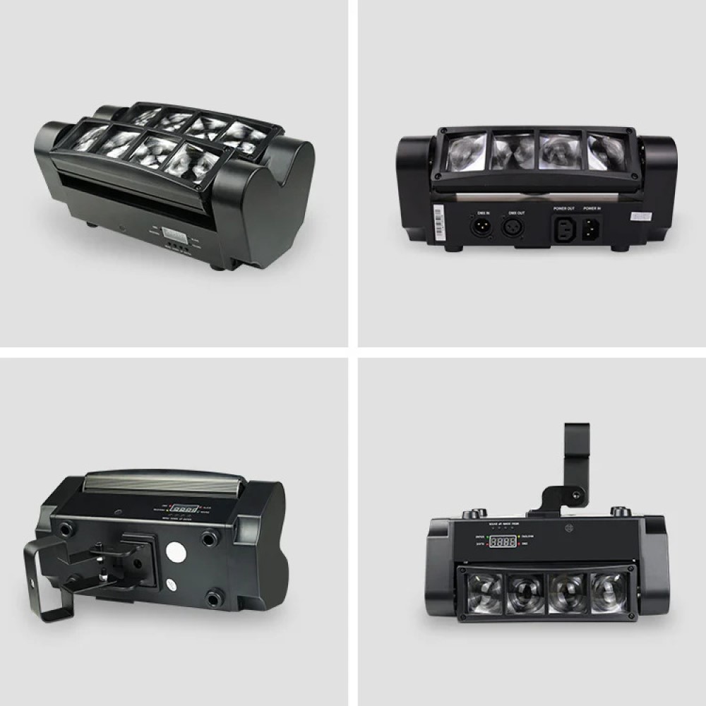 Il propose quatre modes de fonctionnement : automatique, activation sonore, DMX512 (7 ou 13 canaux) et maître/esclave. Chaque bras LED se déplace indépendamment (rotation de ± 60–150°), créant un effet visuel « araignée » saisissant. Le refroidissement est assuré par ventilateur, garantissant une utilisation prolongée sans surchauffe.