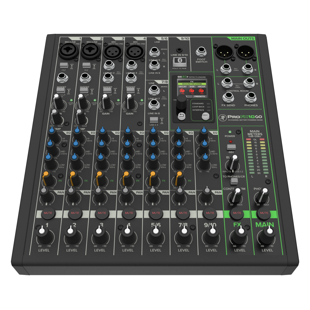 Le ProFX10 GO vous permet de voyager partout tout en profitant des performances exceptionnelles de quatre préamplis Onyx™ primés, caractérisés par un bruit de fond extrêmement faible et une marge dynamique élevée. Avec un gain jusqu'à 60 dB, des filtres coupe-bas à 100 Hz et une alimentation fantôme 48 V, ces préamplis sont compatibles avec tous les microphones.